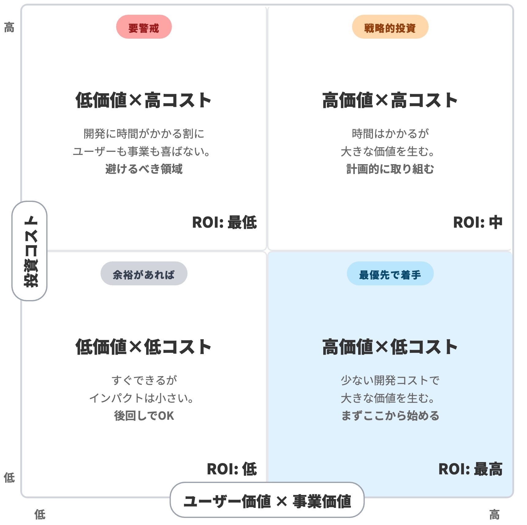 この価値には「ユーザー価値」と「事業価値」という2つの軸があります。ユーザー価値とは、ユーザーがサービスを「便利だ」「嬉しい」と感じるような要素です。一方、事業価値は、売上や利益の向上につながる要素を指します。