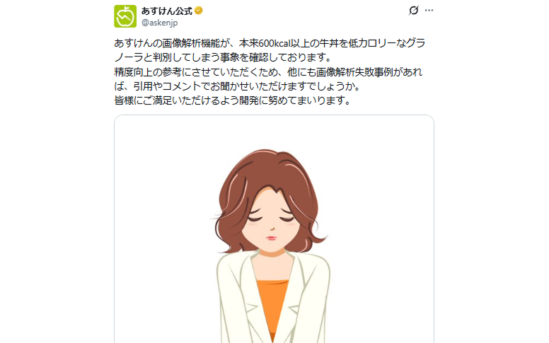 1週間後、運営のasken社は、公式Xにて一連の投稿に反応。それは重々しい謝罪文などではなく、「精度向上のため、他にも画像解析の失敗事例があれば教えてほしい」という、前向きな呼びかけでした。このポストは好意的に受け止められ、実際にさまざまなエラーのスクリーンショットが、ユーザーから寄せられていきました。